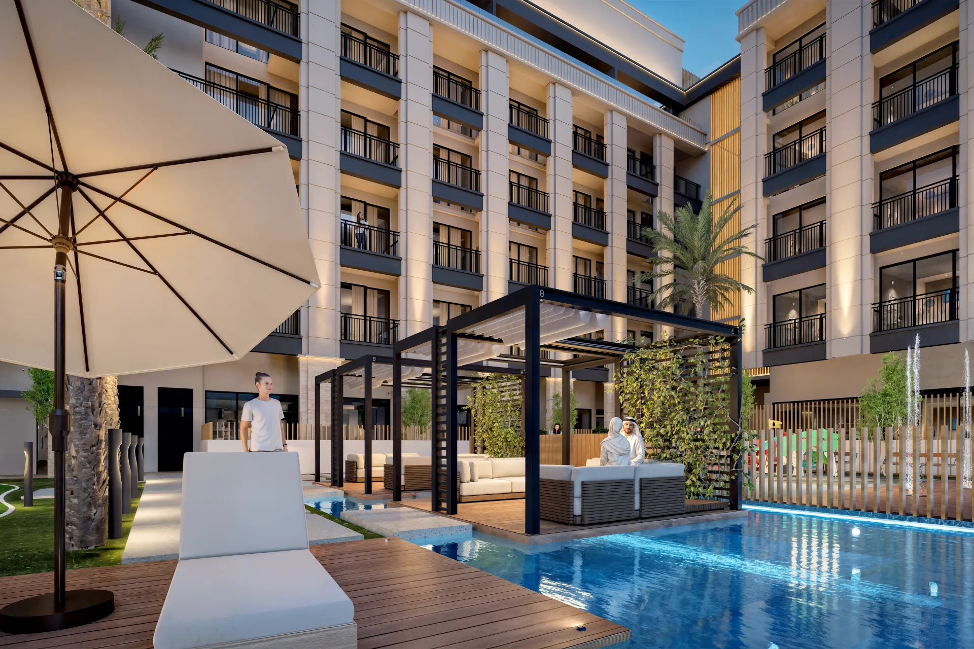 Amenities: Infinity pool, landscaped courtyard, fitness lounge, art room, kids’ play area
