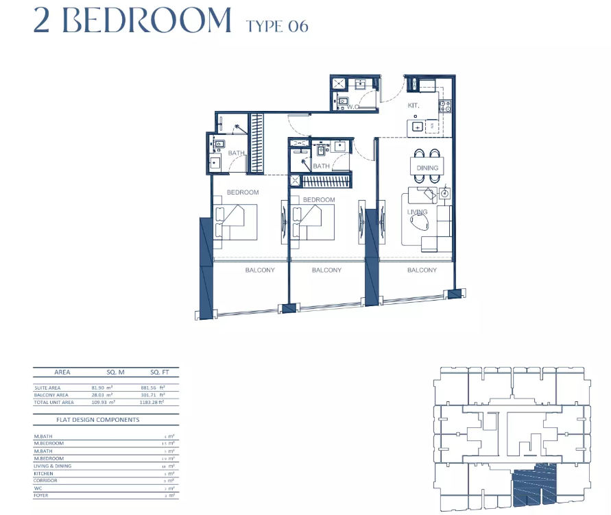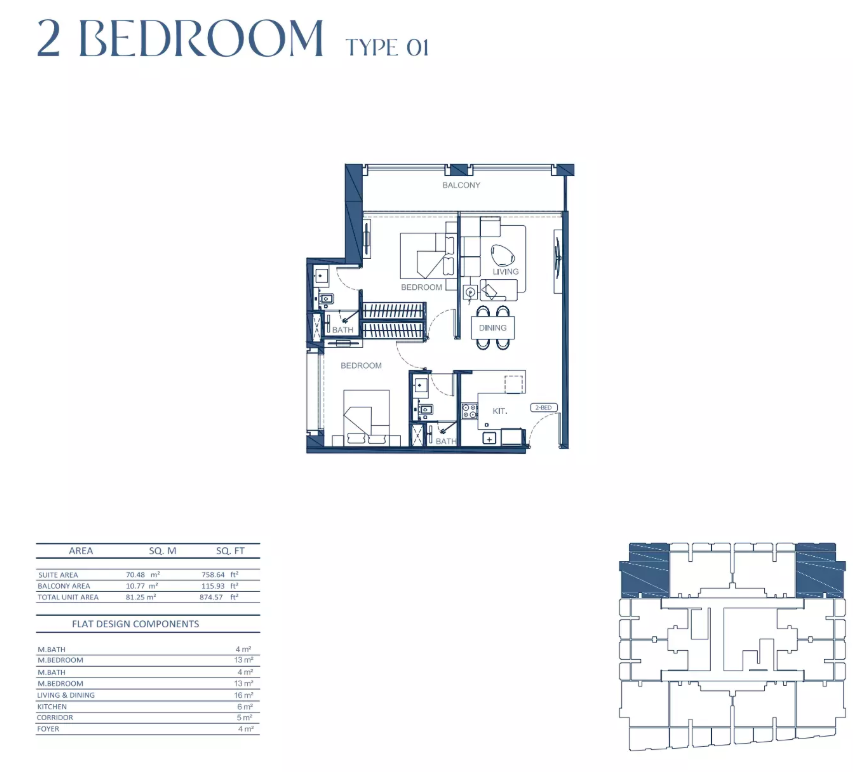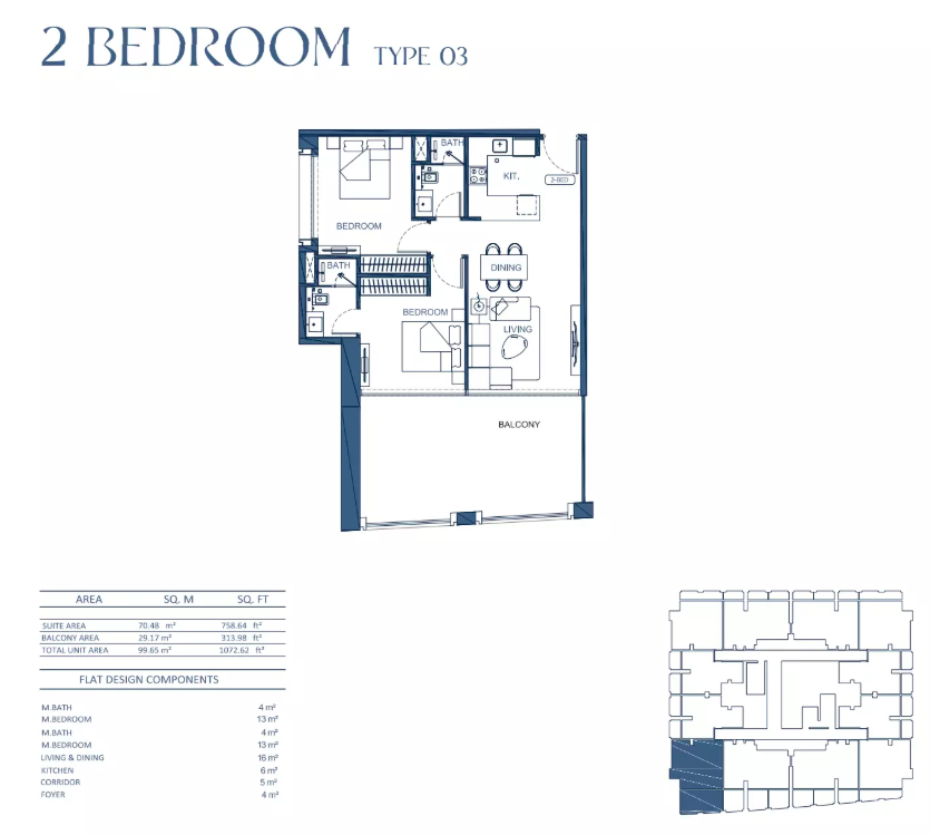 Types: 1BR, 2BR, 3BR apartments; office suites; retail shops