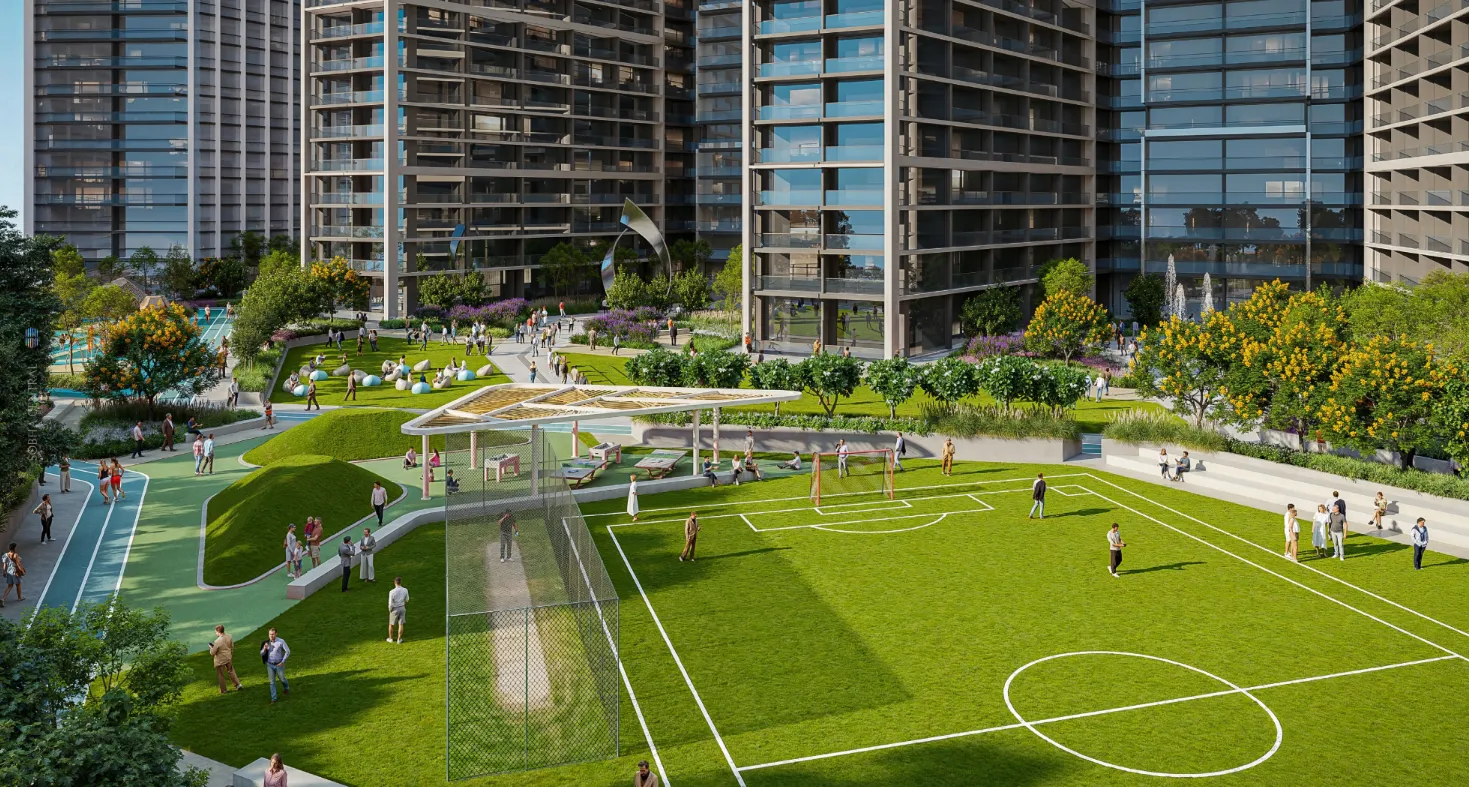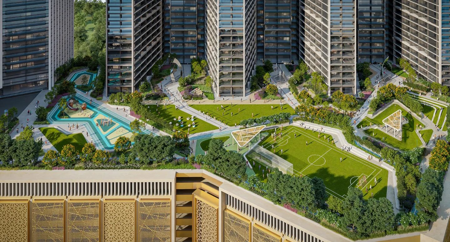 Design Ethos: Expansive glass façades, flowing interiors, and serene podium landscapes
