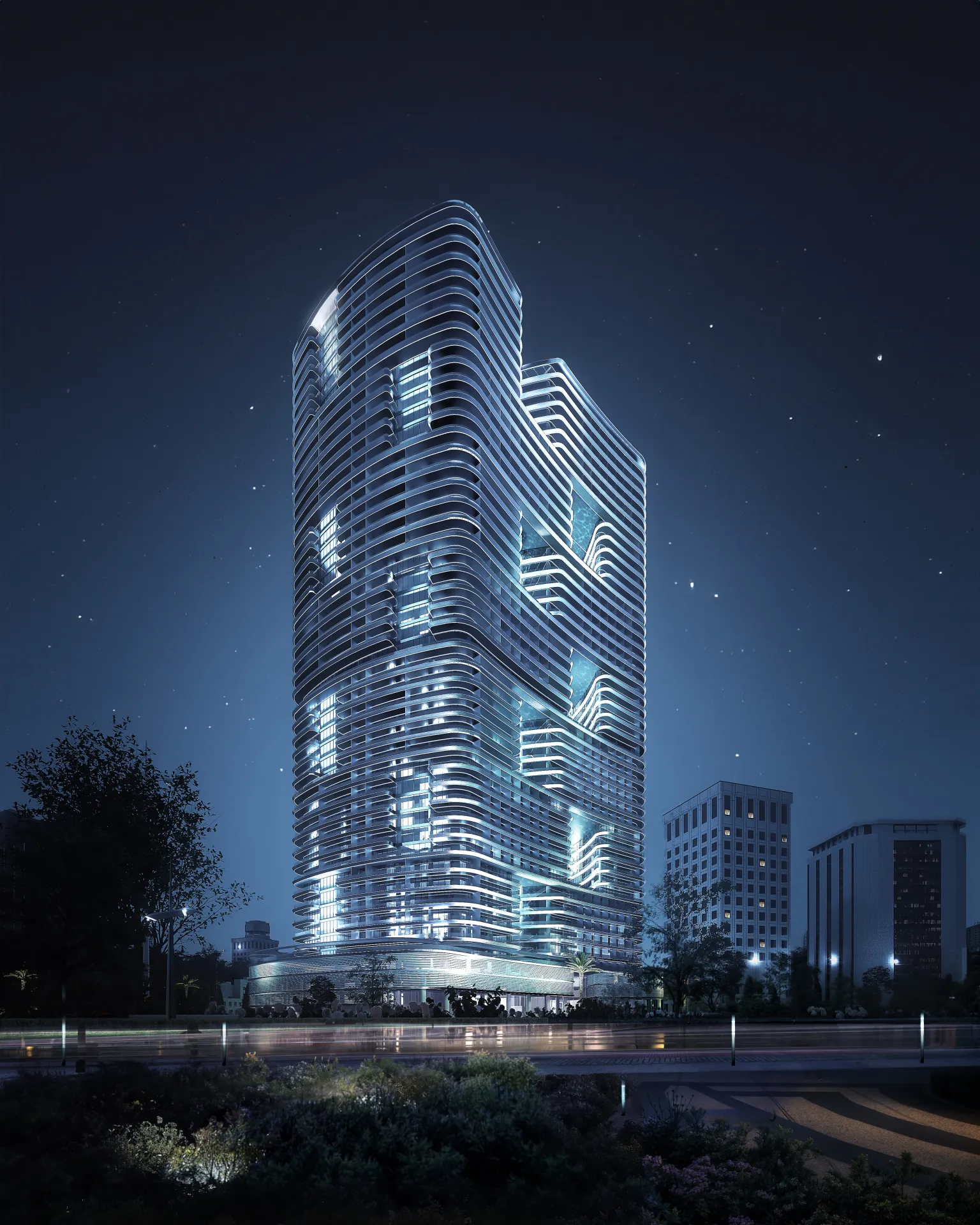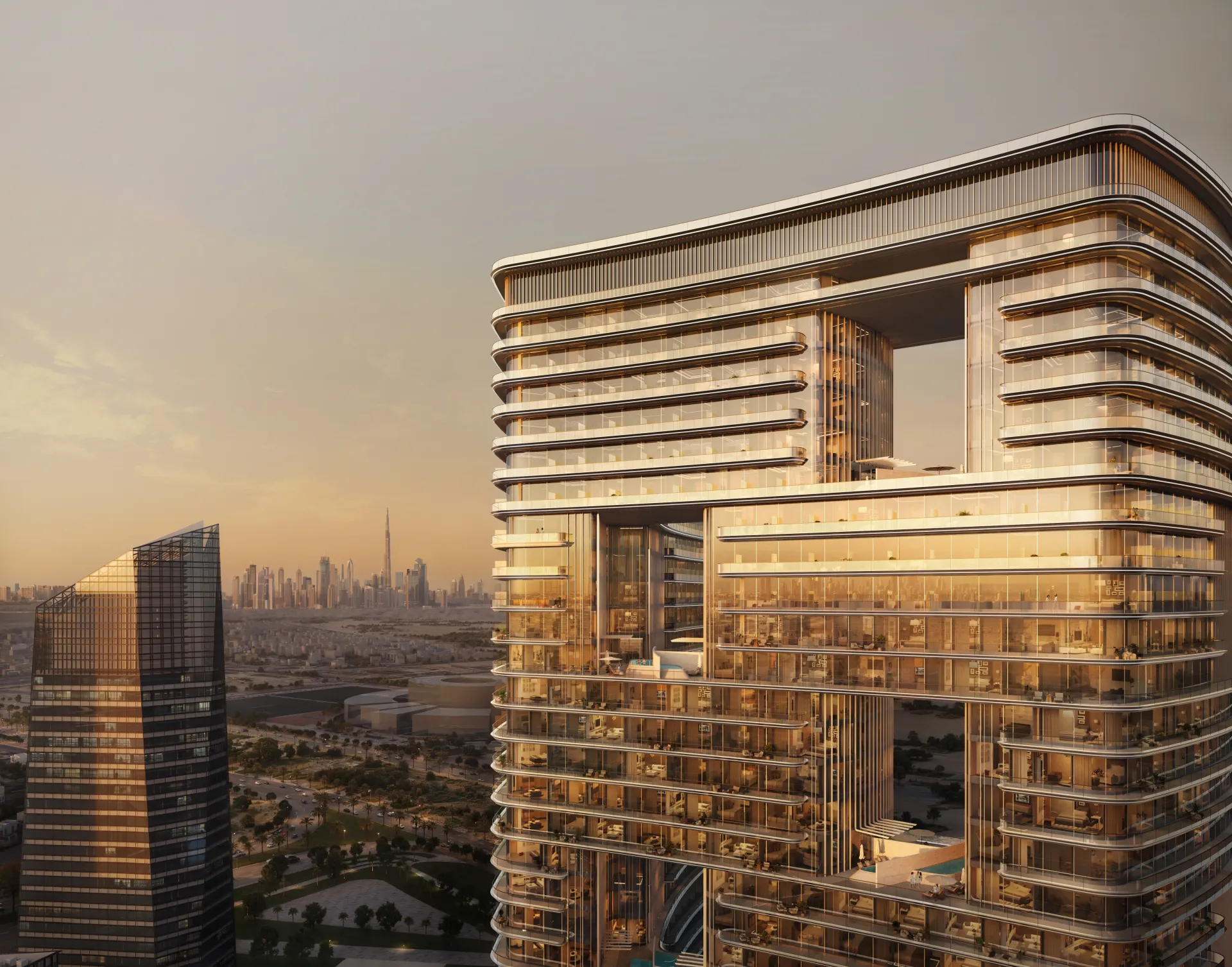Design Ethos: Hillside-inspired tiered architecture with bronze-and-glass façades and panoramic views