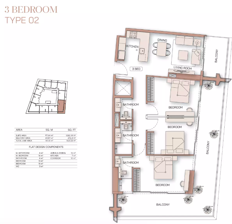 Types: 1BR, 2BR, 3BR apartments (sizes from ~1,076 sq. ft. to 1,523 sq. ft.)