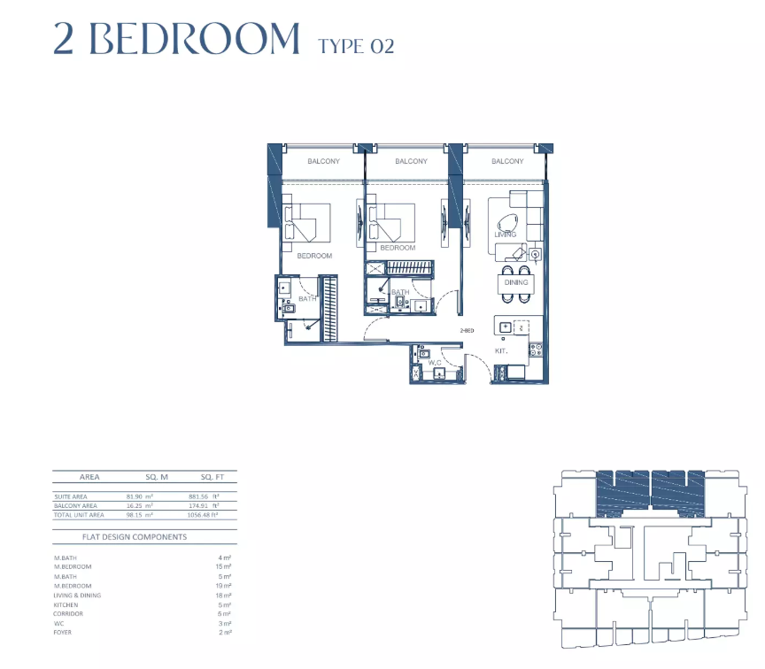 Types: 1BR, 2BR, 3BR apartments; office suites; retail shops