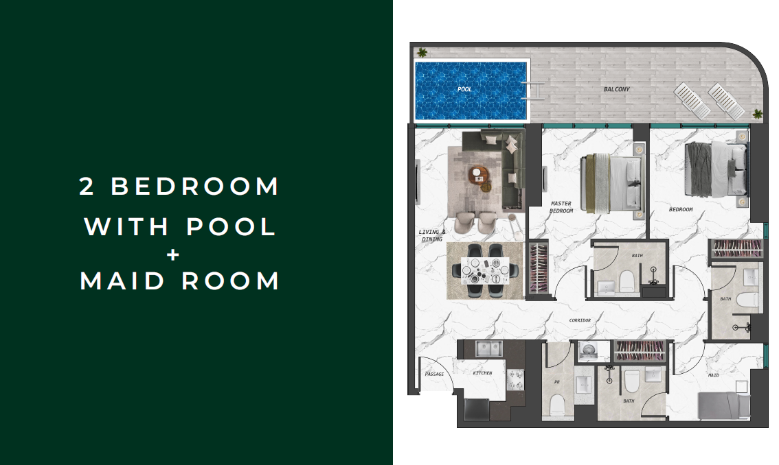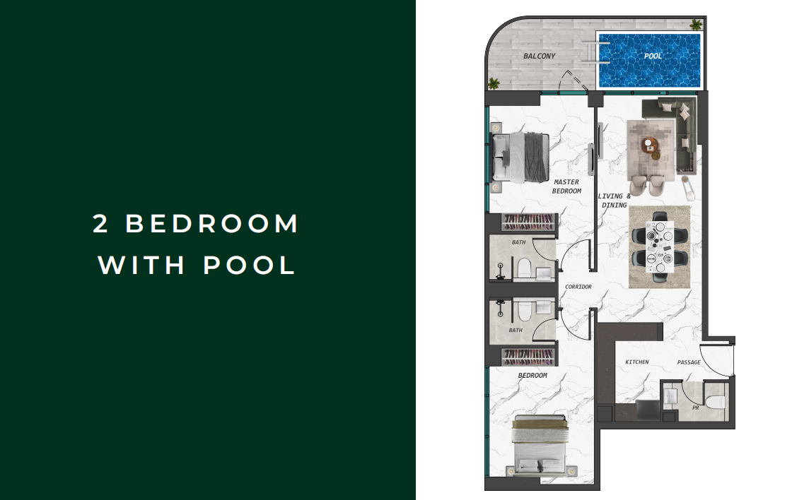 Lifestyle Features: Private pools in select units, expansive leisure deck, water features, and wellness amenities