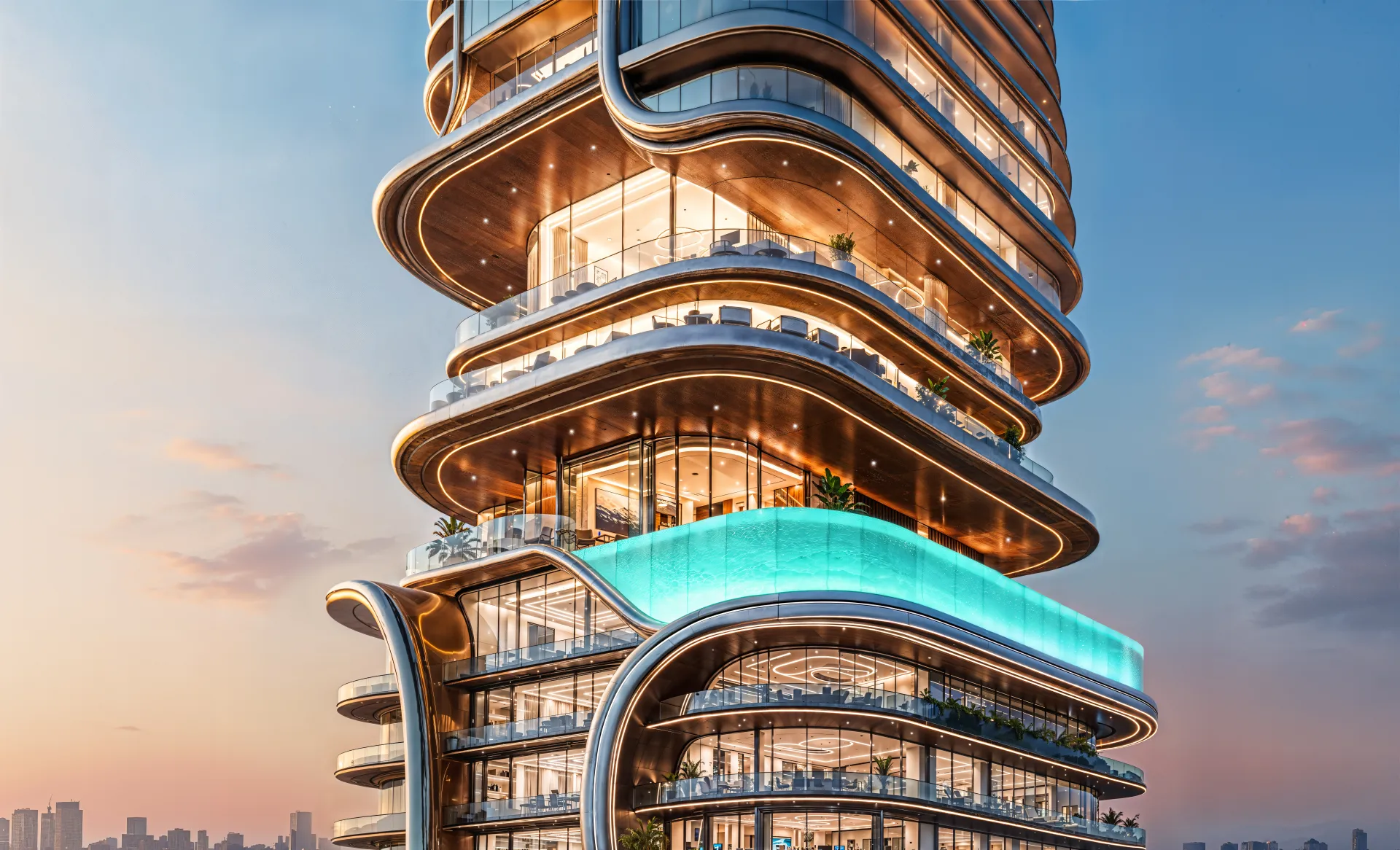 Design Ethos: Inspired by cinematic glamour, premium finishes, intelligent layouts, and expansive glass façades